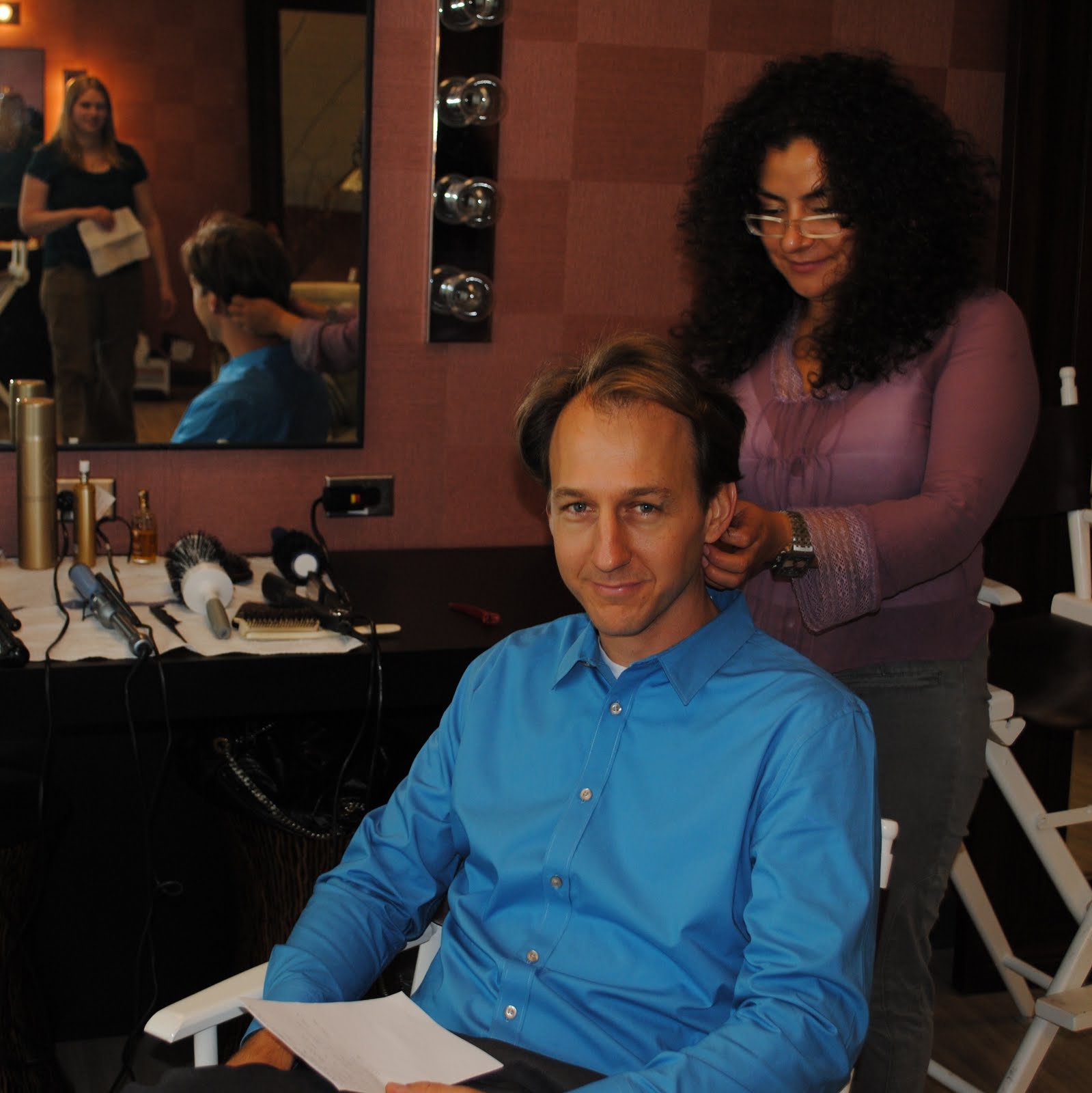 The next morning, we were picked up by our driver (see how that works? impressive, right?) and went to the studio. We had a quick briefing, where we found out that *surprise!* Mark would be on camera, too. We talked very quickly with the producer and then went into hair and makeup, where an enthusiastic makeup artist applied the most heavy makeup I’ve seen on my face since Prom ’93.