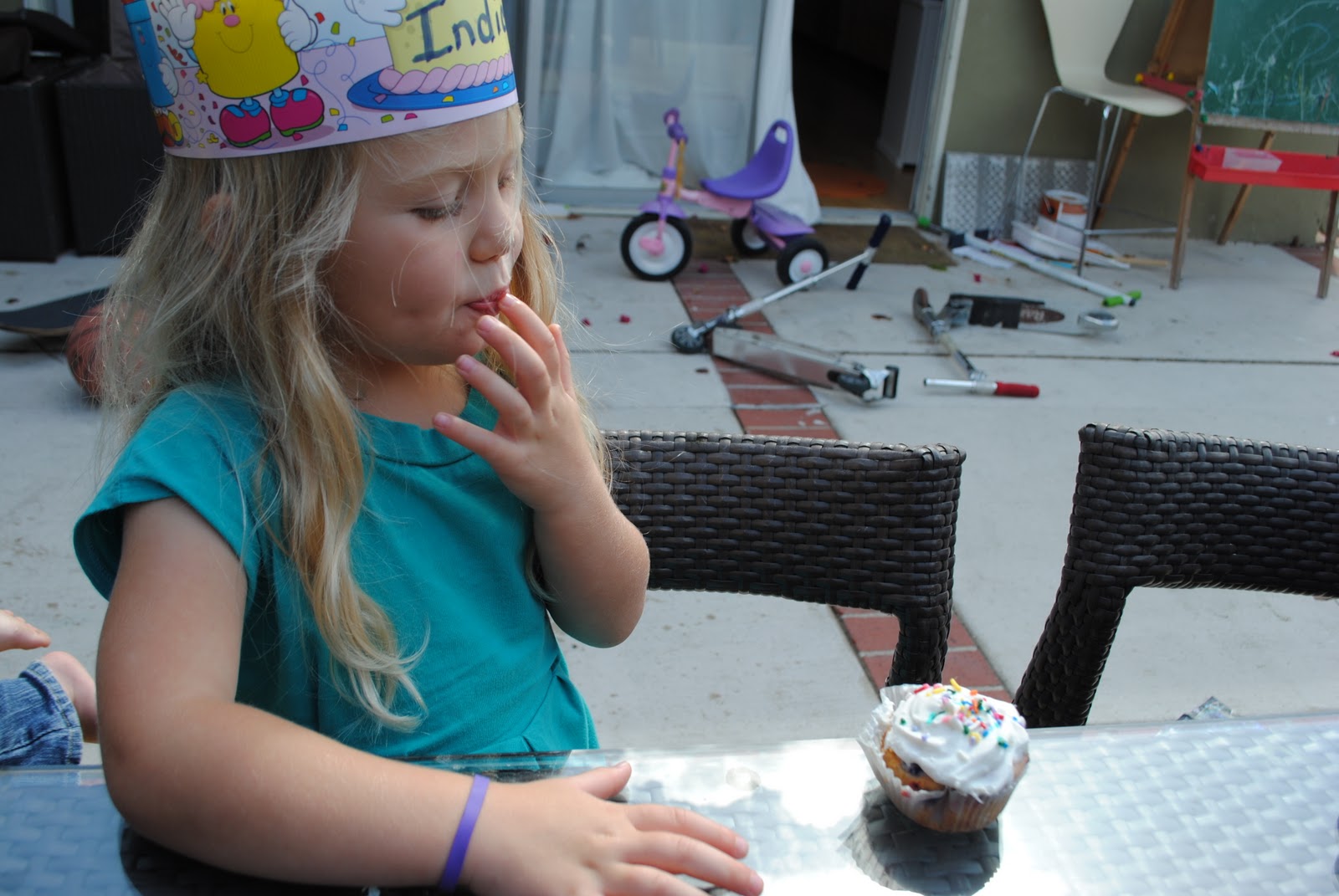 So, when we got home, we had an impromptu party in the backyard, because Karis, Jafta and a couple of his friends who were over had not sampled the cupcakes.  They saw the leftover goodies in my cupcake carrier and begged.  We all sat around the table, sang happy birthday to the kids (while explaining that there was still an ACTUAL PARTY that would be happening on their ACTUAL BIRTHDAY, where daddy and more friends would be present).