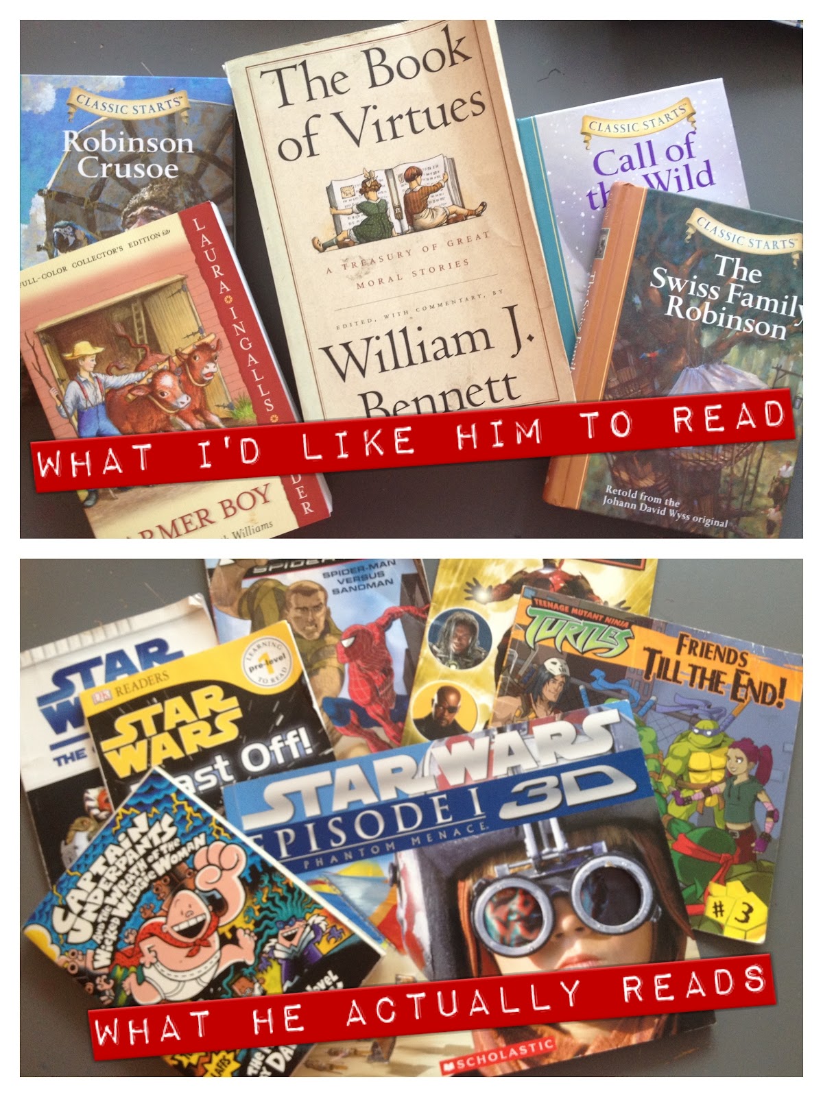 I know it’s tempting to buy more sophisticated books for your children, especially if you are a bibliophile yourself. When my kids were small, I invested in many of the classics for my kids. And while I would love to report that my second grader is currently reading Call of the Wild, the truth is that the book that hold his attention on the books full of characters from the movies and comic books. It may not be highbrow, but he loves to read it. Surrender your ideas for what your kids SHOULD read, and invest in books that they WILL read.