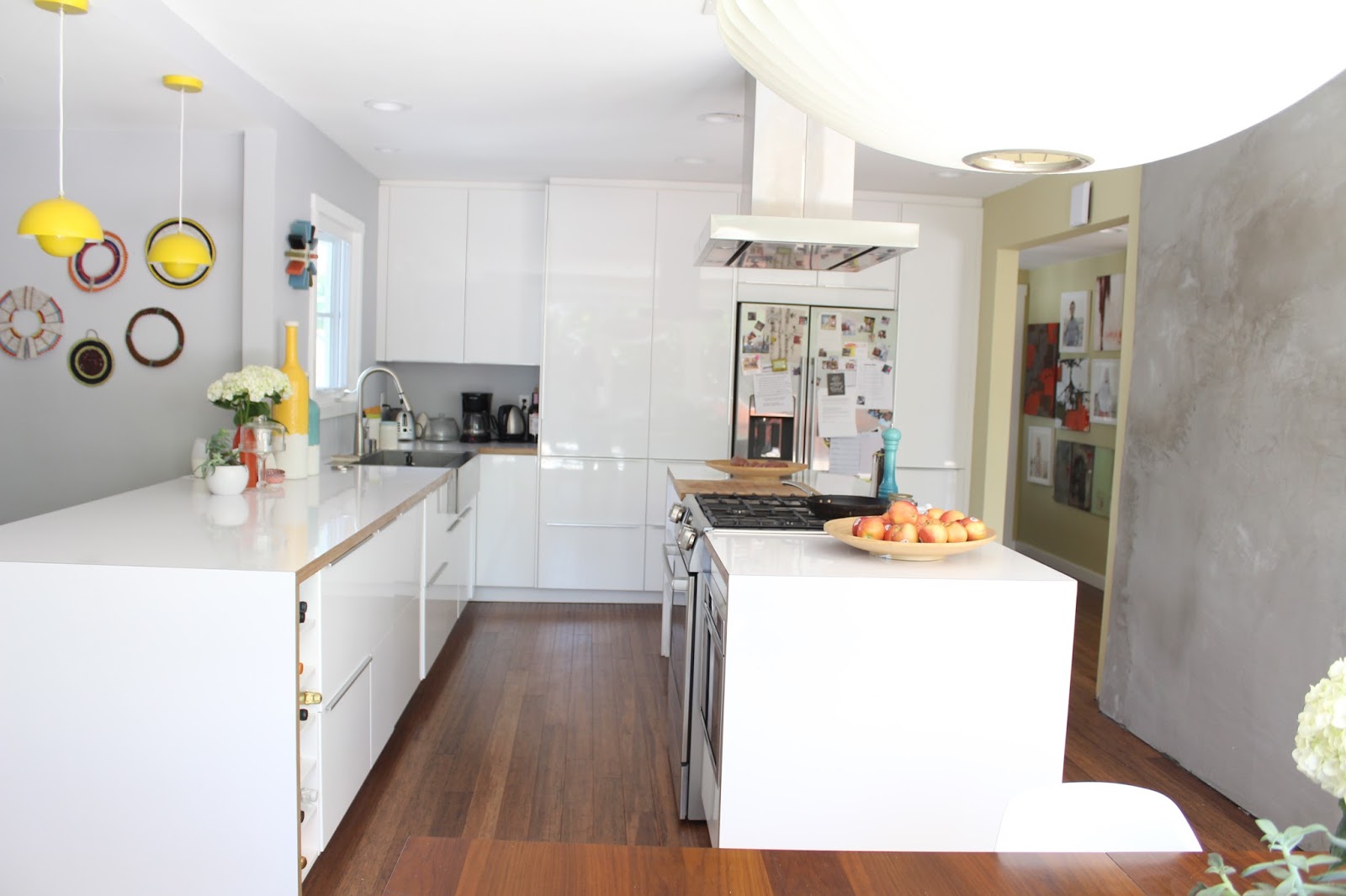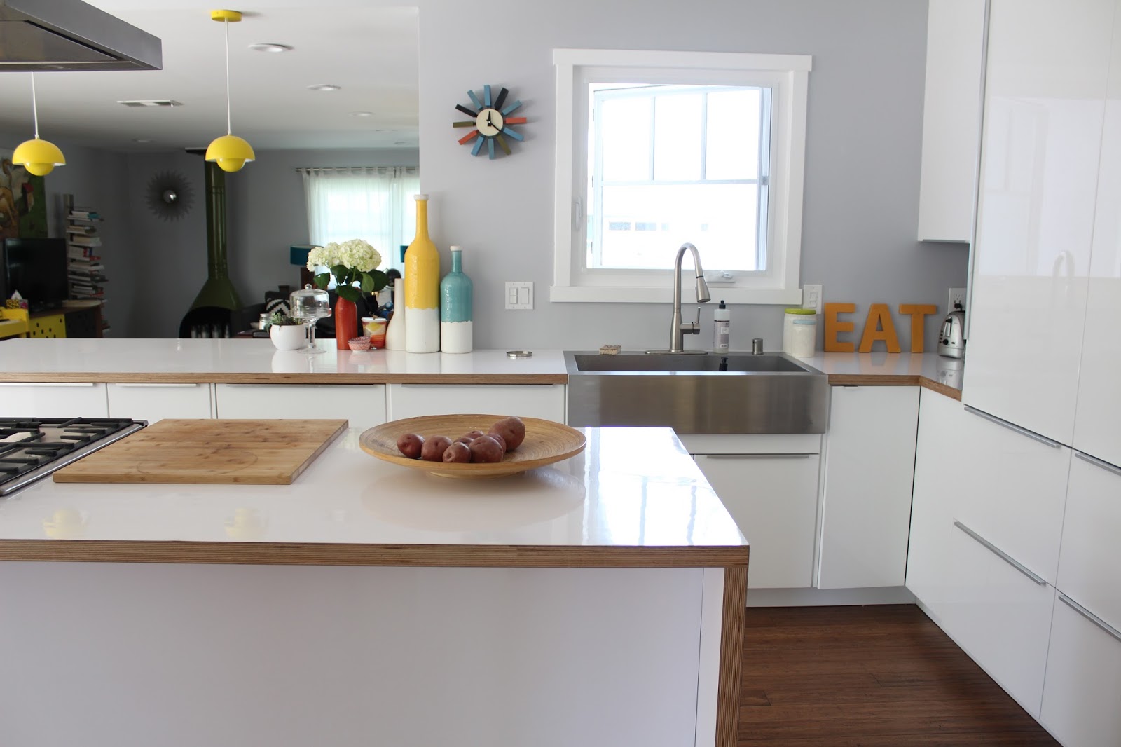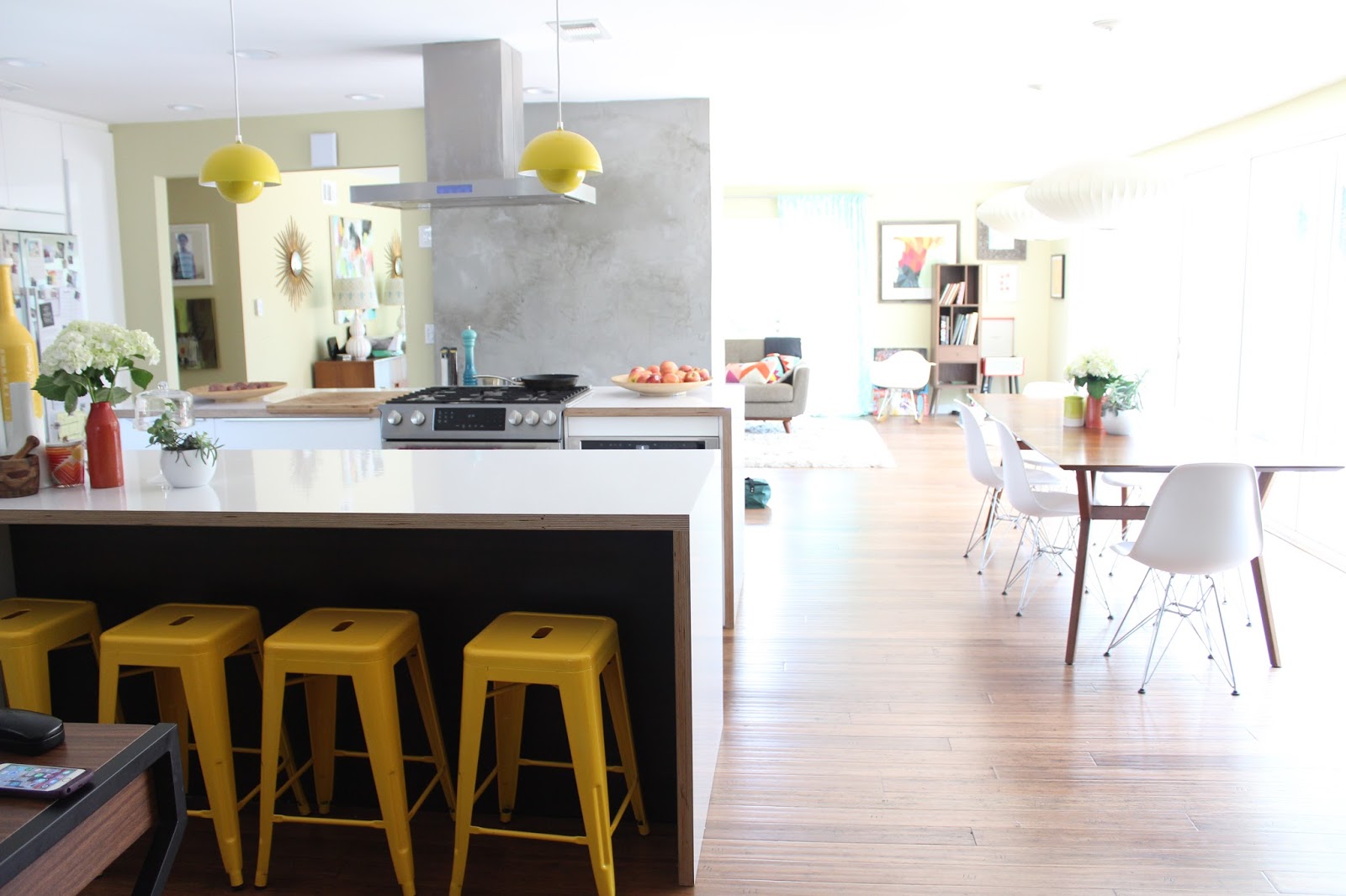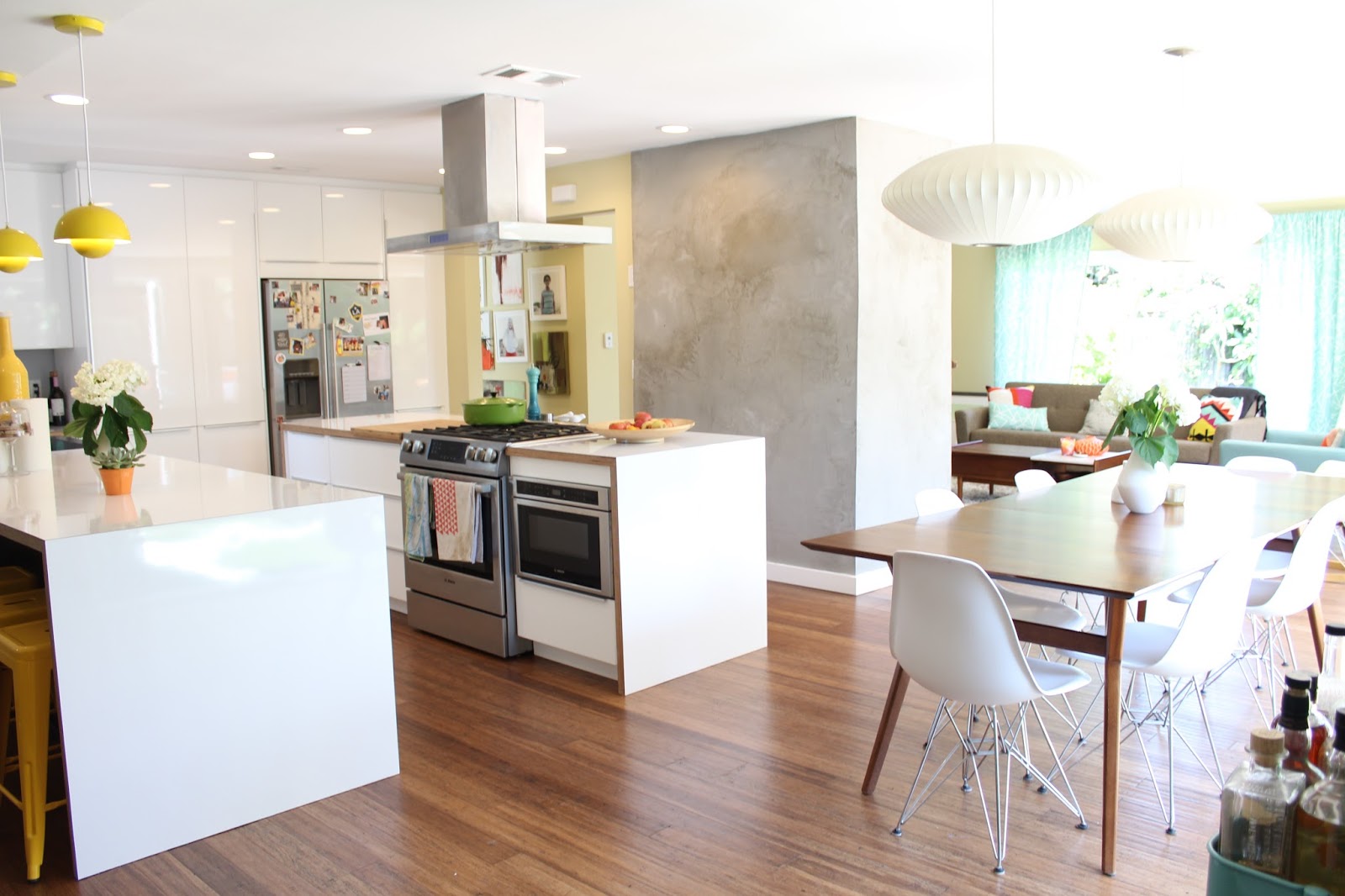 The kitchen opens to our dining area, which sits right in front of the wall of panoramic doors. Our mid-century kitchen table is from West Elm and the chairs are Eames-inspired from Rove Concept. The Nelson pendant lights are from Modernica, and the yellow pendant lamps are from Gilt.