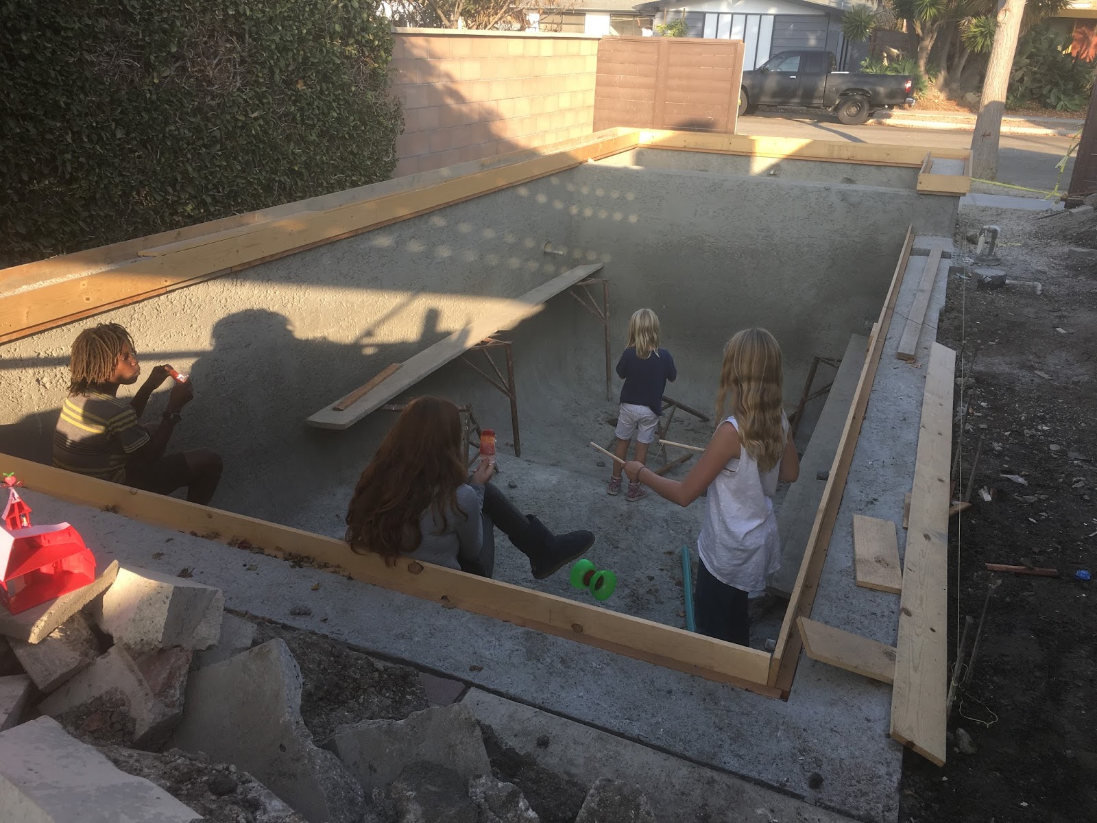 It’s now a giant hole in the backyard that we have pizza parties in. And a giant pile of concrete that of course is now the preferred spot to play.
