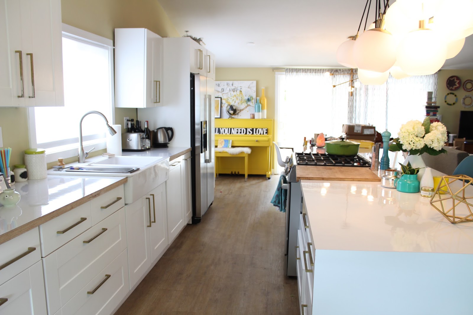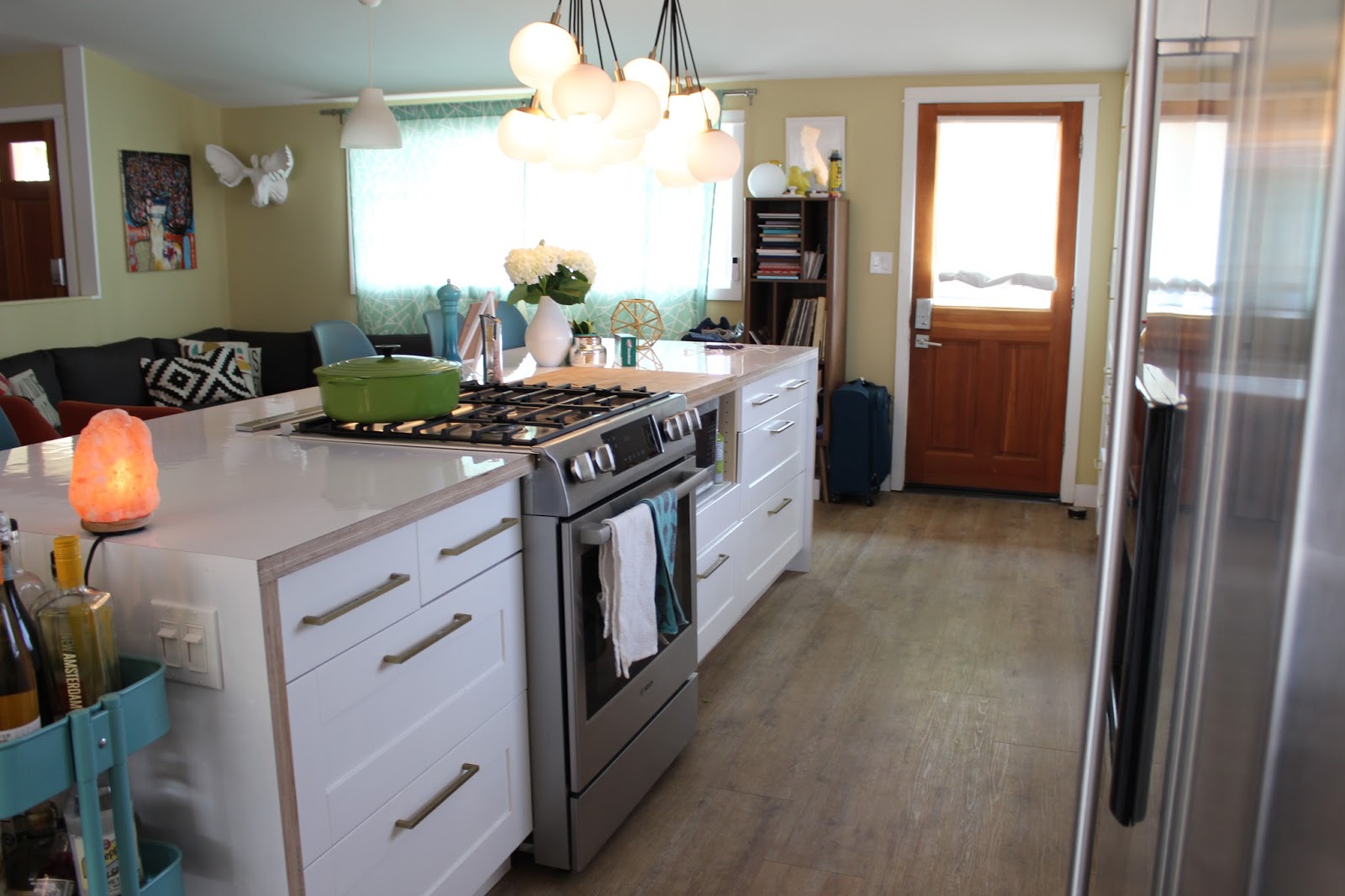 Rather than an island, this kitchen had a wall with pantries and a refrigerator. The result is that I couldn’t see anyone in the living room while I was in the kitchen . . . so the kids ended up plopping on the floor of the kitchen when I was in there working. I wanted to create an island, and move the fridge to the other wall, to give this house a more open concept. But I was limited on both time and budget.