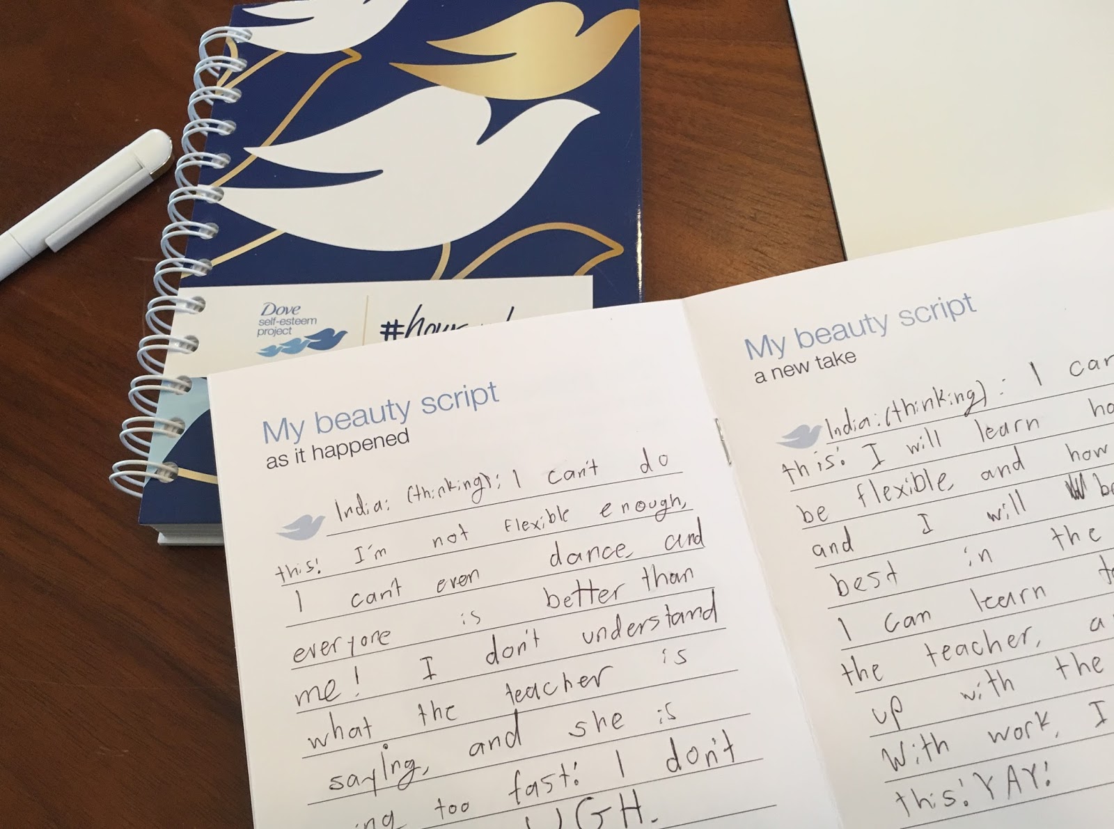 I spent an hour of time with my daughter India, talking through how she sees and feels about herself. It was illuminating. For the most part, she feels pretty great about herself. But she does have moments where she can really lack confidence and spiral into self-doubt. We talked through one moment like that . . . when she went to a new dance class for the first time. Using the Dove Self-Esteem Project’s prompts, we worked through the negative script that was playing in her head.