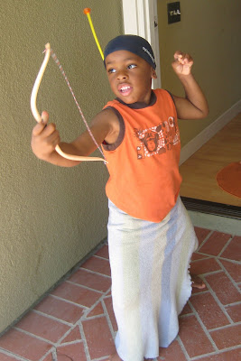 His second attempt was less violating, but not much closer to looking authentic. This time, he used his blanket as the skirt and a swimcap as his hat (with compulsory arrow, of course). He was pretty pleased with himself: