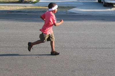 He has also been asking for an ipod so he could “go on a run” like I do. I found a little flash drive at Target that plays MP3’s through earbuds. It was $9.99, and holds 40 songs. I loaded it with High School Musical and Ozomatli, and he is convinced it’s an ipod just like mine. The problem was, the earbuds wouldn’t stay in his little ears. I bought him an old-school set of headphones, but he wasn’t having that. He ran to his room, and came out with a sweatband that would go around his ears and hold the earbuds in. And then he went on that run.